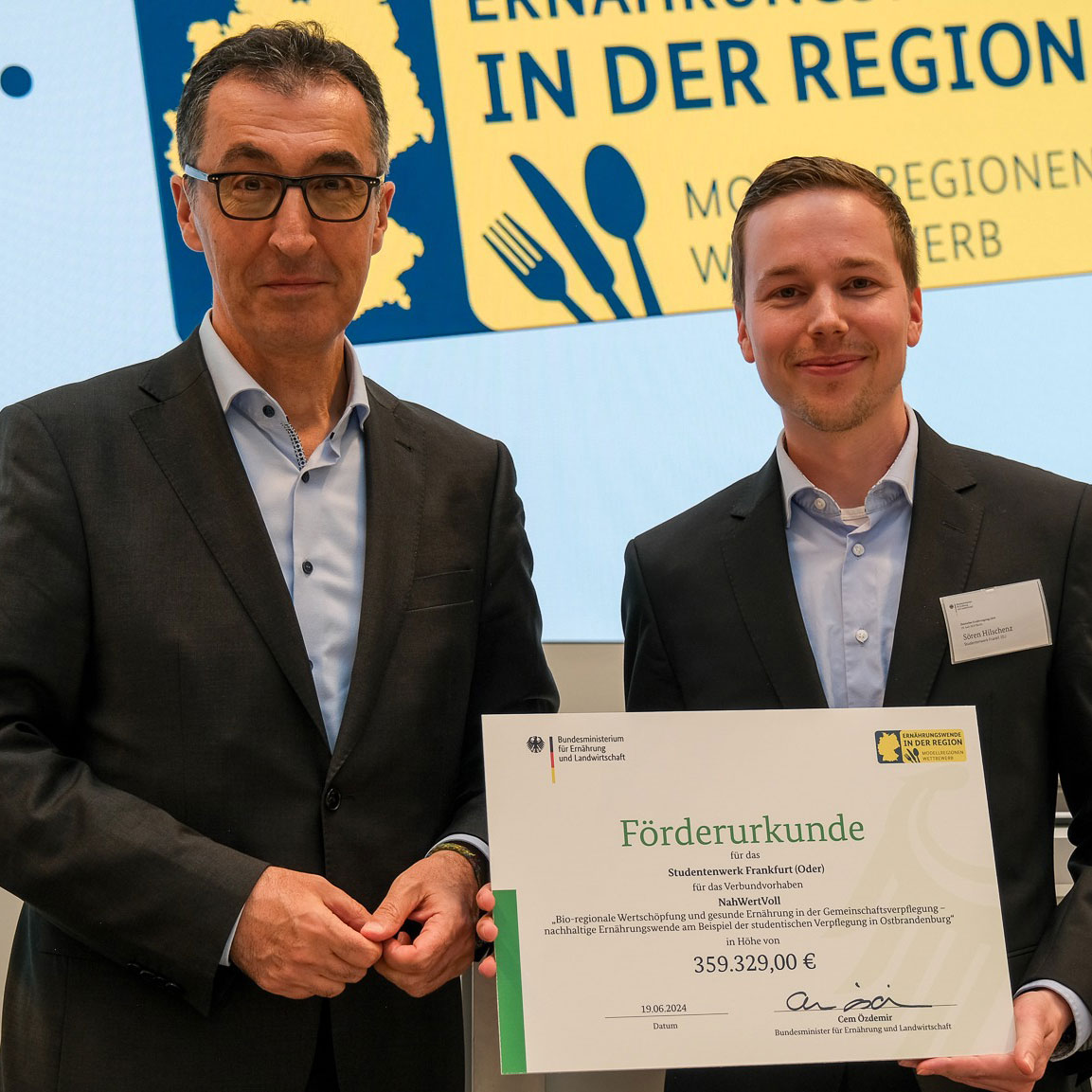 Im Modellregionenwettbewerb des Bundesministeriums für Ernährung und Landwirtschaft „Ernährungswende in der Region“ haben wir uns mit unserem Projekt „NahWertVoll“ durchgesetzt und durften am 19. Juni beim 1. Deutschen Ernährungstag in Berlin eine Förderurkunde über 359.329 Euro von Bundesminister Cem Özdemir persönlich entgegennehmen. Das Projekt wird im Verbund mit der Hochschule für nachhaltige Entwicklung in Eberswalde durchgeführt, welche dafür ebenfalls eine Förderurkunde erhielt. Das Projekt startete im September 2024 und wird bis 2027 laufen. Ziele des Projektes sind die Erhöhung des Bio-Anteils auf 30 Prozent bis zum Ende der Projektlaufzeit, die Reduzierung von Lebensmittelabfällen, die Implementierung eines täglichen DGE-konformen Essens und der Aufbau von regionalen Wertschöpfungsketten, konkret im Bereich von Hülsenfrüchten aus Brandenburg.