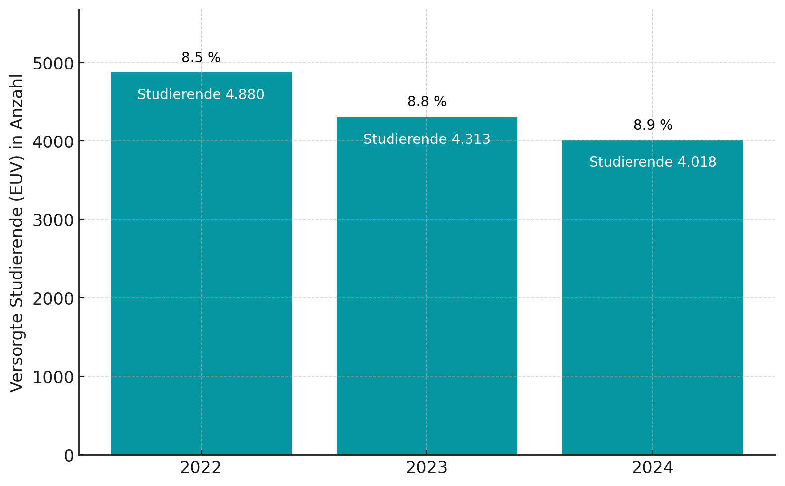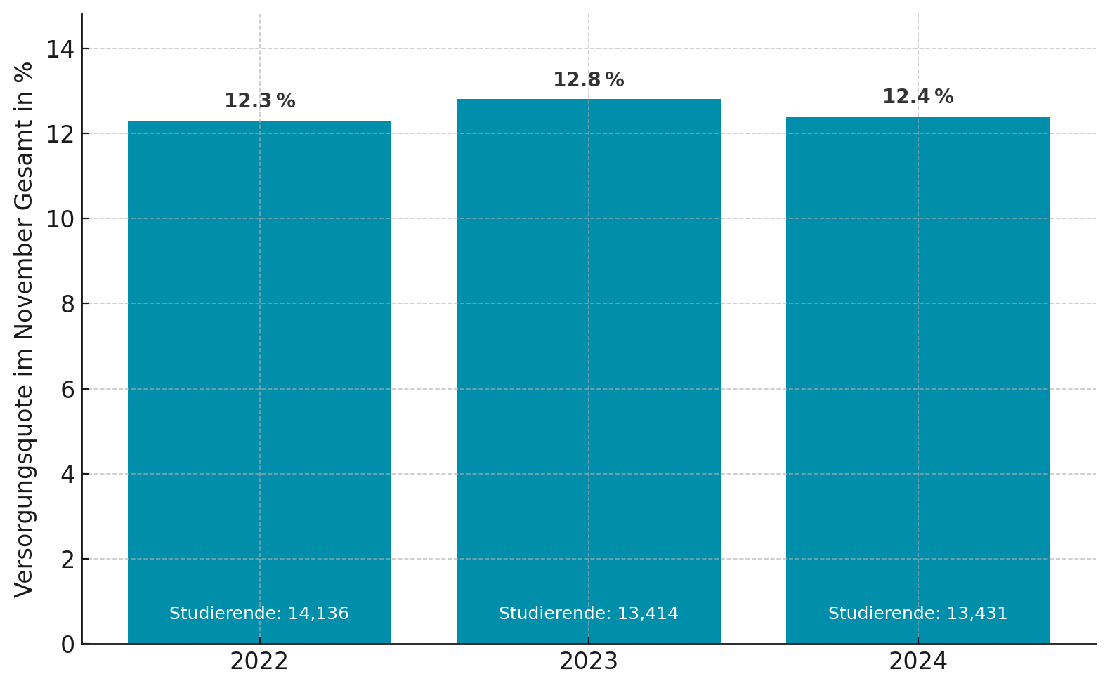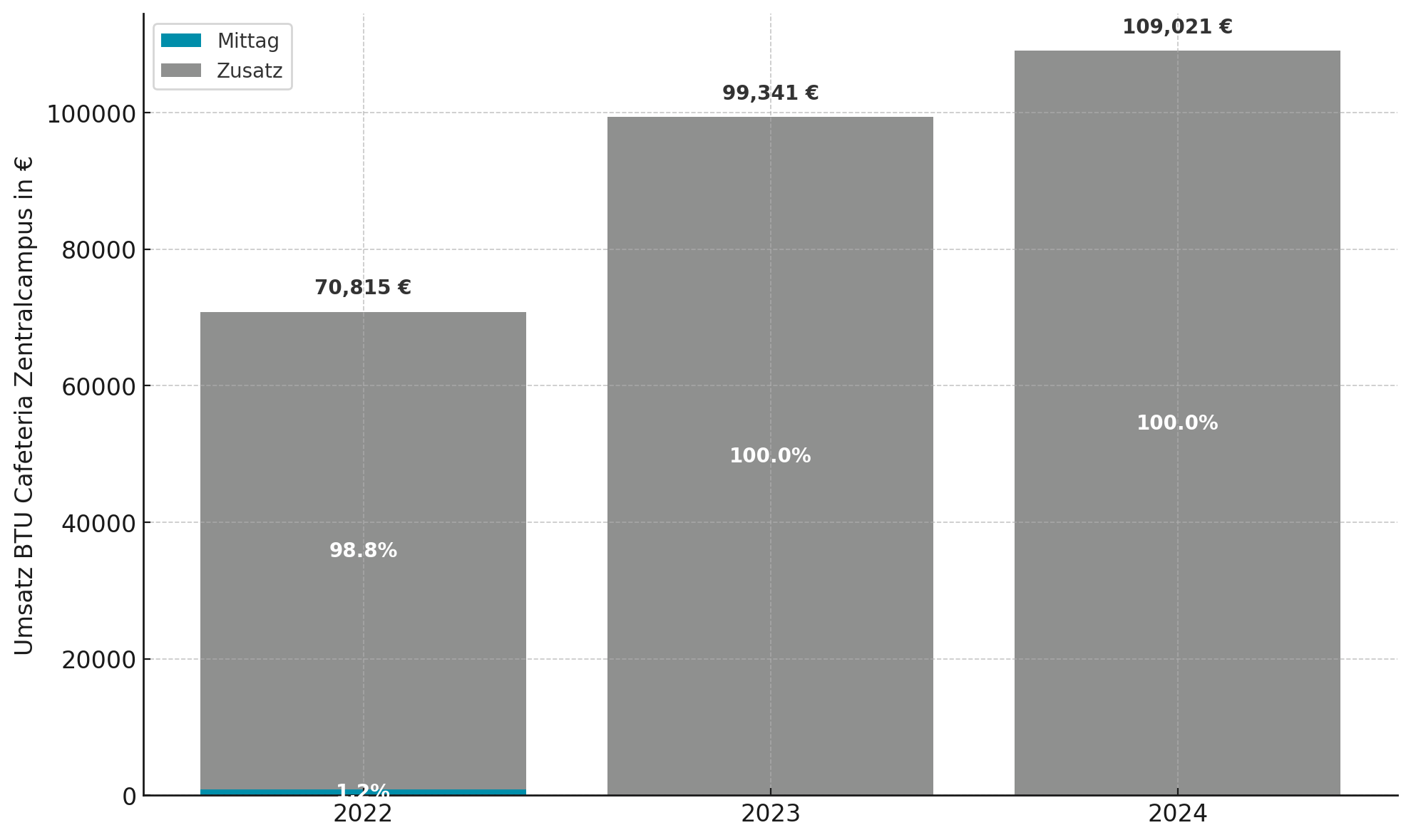 Bedeutsame Veränderungen haben sich im Jahr 2024 durch die Zusammenarbeit mit Kantine Zukunft ergeben. Wir haben gemeinsam komplett neue Speisepläne aufgesetzt, welche nicht nur Kritiken aus der Mensaumfrage 2022 berücksichtigten, sondern auch die Art zu kochen in den Mensen verändert hat. Der Anteil stark vorverarbeiteter Rohstoffe wurde drastisch reduziert, stattdessen dominieren nun noch stärker das Handwerk und frische Produkte unsere Küchen. Der Bio-Anteil wurde massiv auf 20 Prozent erhöht, was uns das Bronze-Siegel nach neuer Bio-Außer-Haus-Verpflegung-Verordnung (Bio-AHVV) einbrachte und gleichzeitig die Wareneinsatzquote sinken ließ, denn Convenience ist natürlich deutlich teurer als unverarbeitetes Gemüse. Weiterhin haben wir sichergestellt, dass jeden Tag ein vollwertiges, attraktives Essen der günstigsten Preiskategorie angeboten wird. Auch im Jahr 2024 blieben die Preise der Studierenden-Essen konstant und der gezahlte Durchschnittspreis für Studierende sank sogar erstmals seit fünf Jahren leicht, auf 3,13 Euro.