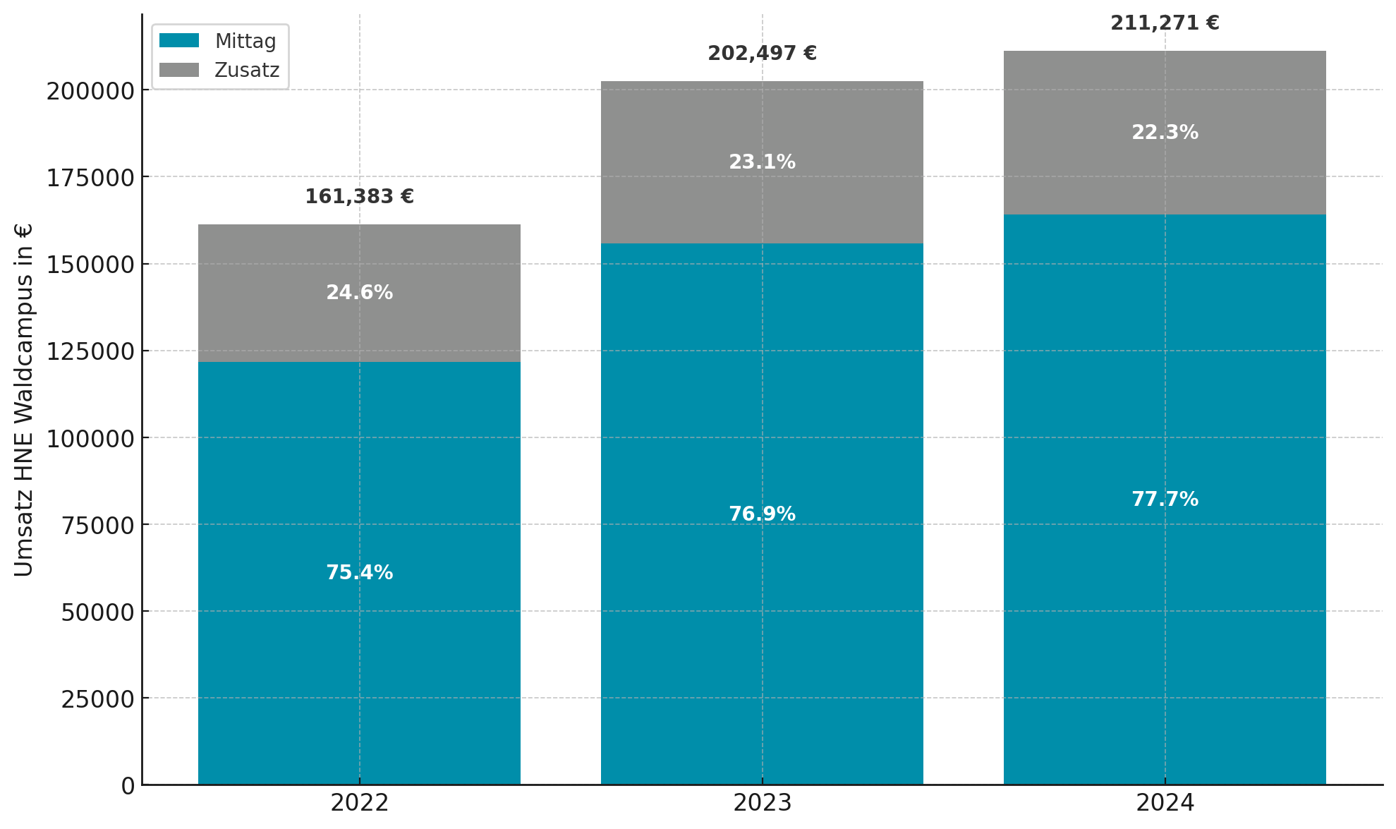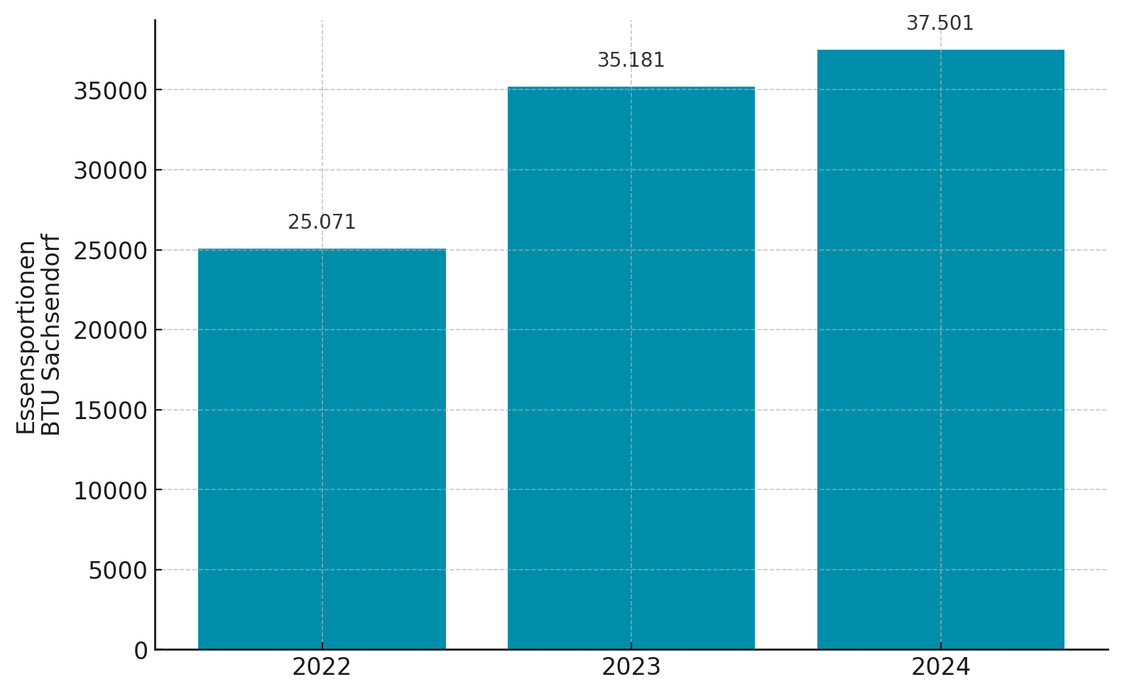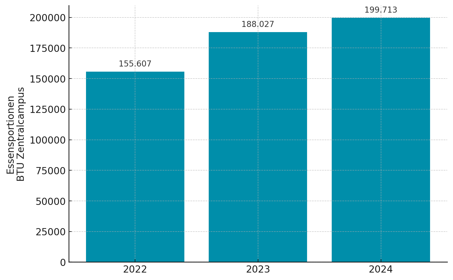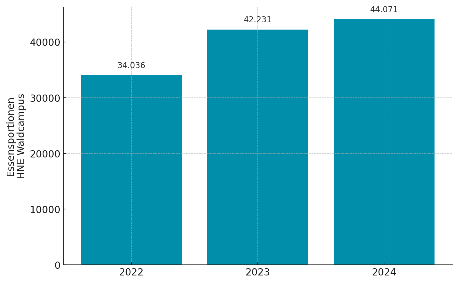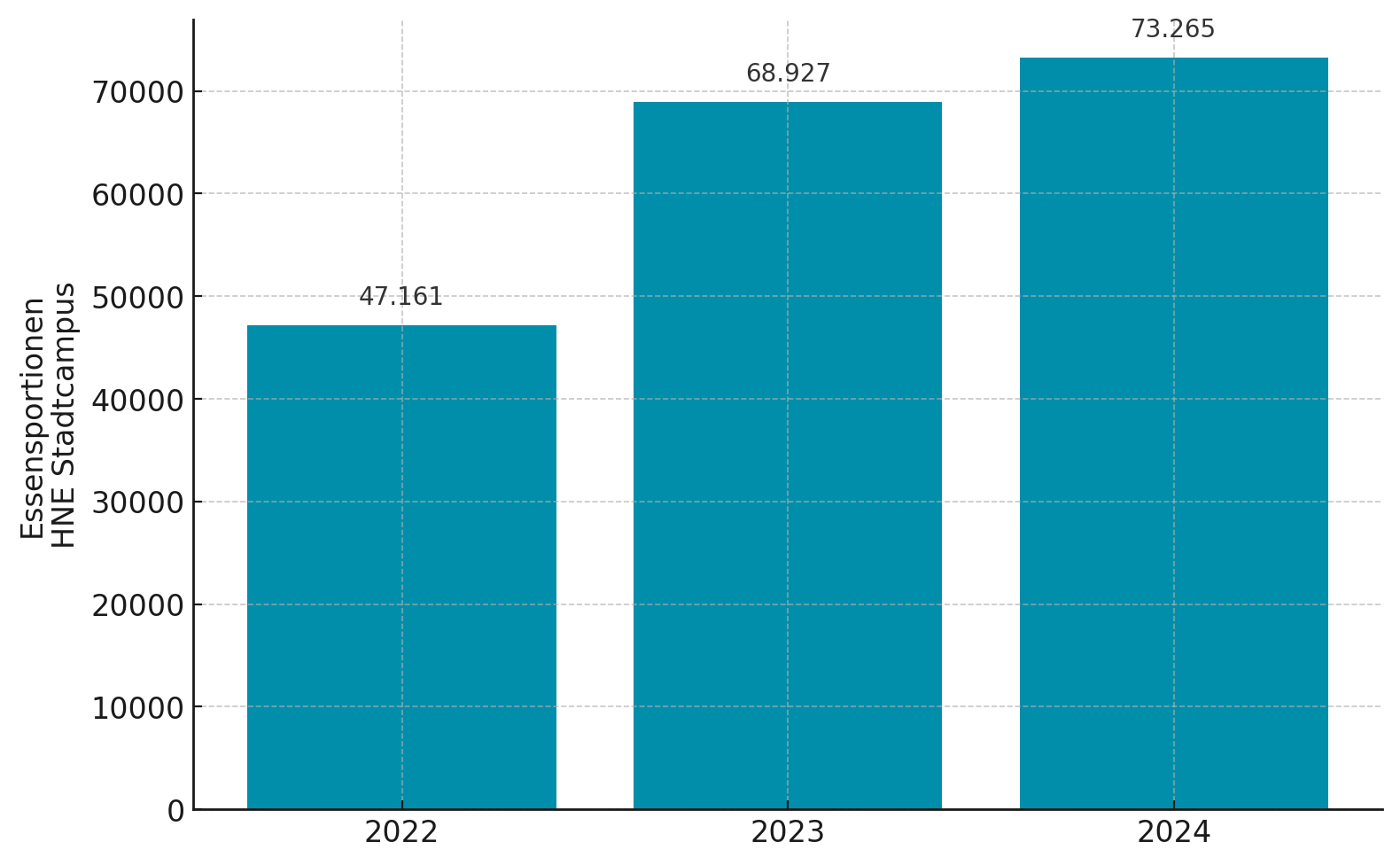 Auch im Geschäftsbericht 2024 und damit im vierten Jahr in Folge können wir von einer steigenden Nachfrage nach unseren Mittagessen und steigenden Umsätzen in der Hochschulgastronomie berichten. Damit nähern wir uns dem Vor-Corona-Niveau weiter an, wenngleich sinkende Studierendenzahlen und eine zunehmende Internationalisierung der Studierenden mit einer stärkeren Präferenz zur Selbstversorgung Herausforderungen darstellen, denen wir in Zukunft noch besser begegnen wollen. So waren es vor allem Nicht-Studierende-Gäste, die 2024 für ein Plus von 6 Prozent bei den verkauften Essensportionen sorgten. Die Zahl der verkauften Studierendenportionen konnte immerhin um 1 Prozent gesteigert werden.