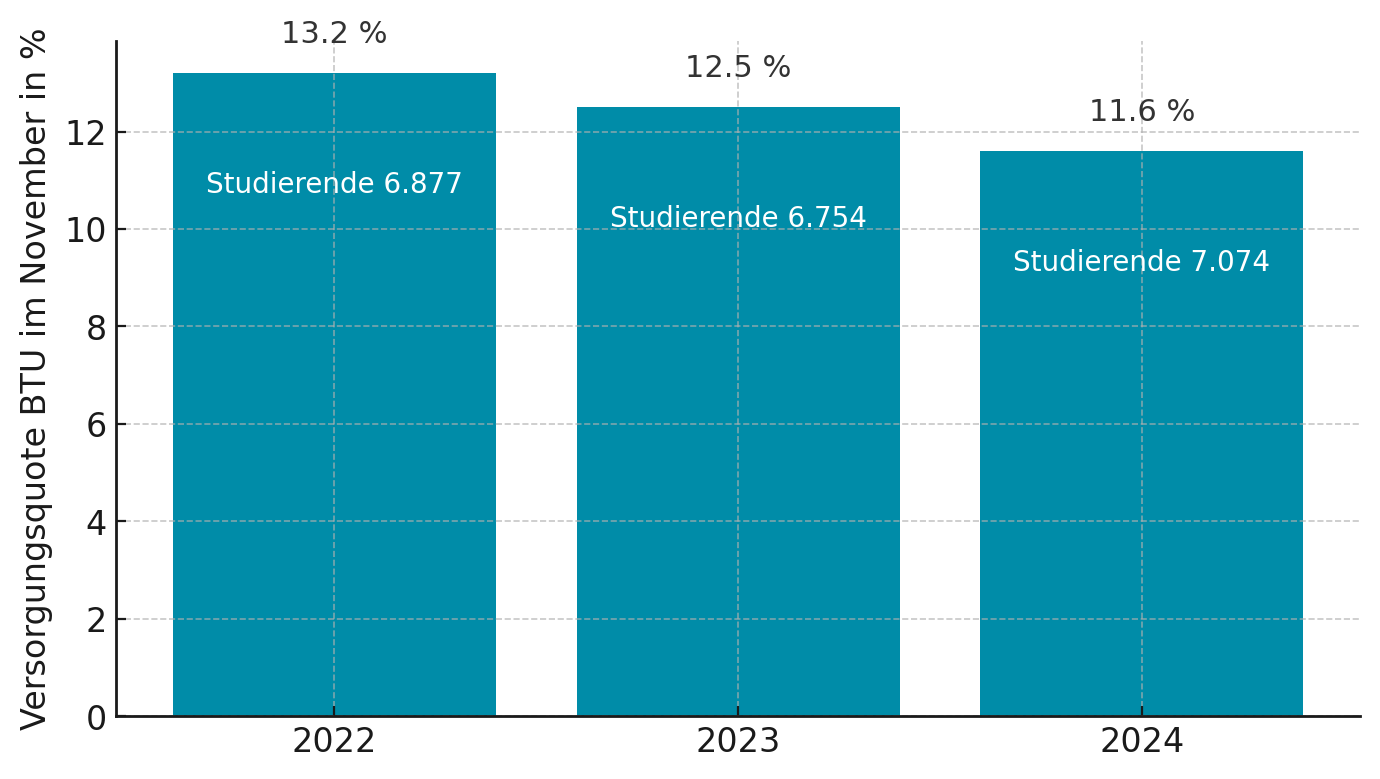 Im Ringen um Finanzmittel für den kleinen Bauunterhalt zeichnet sich nach mehreren Verhandlungsrunden mit dem Land und den Hochschulen eine Lösung ab. Mit Sorgen schauen wir trotzdem auf die zukünftige Betriebsbereitschaft unserer Mensen. Während am Zentralcampus in Cottbus die Fertigstellung der Mensa trotz mehrfacher Verzögerung absehbar ist, werden wir voraussichtlich mindestens bis 2029 auf eine sanierte Mensa am Stadtcampus Eberswalde warten müssen. Ausgerechnet dieser Standort hat jedoch die höchste Auslastung und mit Überschreitungen der Höchstkapazität, Havarien und baulichen Einschränkungen zu kämpfen. In Sachsendorf, Senftenberg und Frankfurt (Oder) steht eine Sanierung noch nicht einmal in Aussicht, weshalb in diesem Jahrzehnt wohl nicht mehr damit zu rechnen ist und die Nutzungsdauer relevanter Küchentechnik unglaubliche 30 Jahre erreichen oder sogar überschreiten wird. Oder vorher ungeplant havariert und die Mensaversorgung einschränkt.